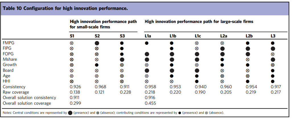 此外,fsQCA检验的结果揭示了大、小规模企业实现高创新绩效的不同路径,小企业可以通过管理层薪酬激励、内部锦标赛或员工锦标赛来激励创新;大企业可以走不同的道路,包括管理层股权激励、管理层低薪酬与企业战略成长的结合,或管理层薪酬与股权激励的结合。不同薪酬差距和企业创新之间错综复杂的相互作用也取决于行业和企业特征,因此,我们的研究强调了精心设计薪酬结构的重要性。