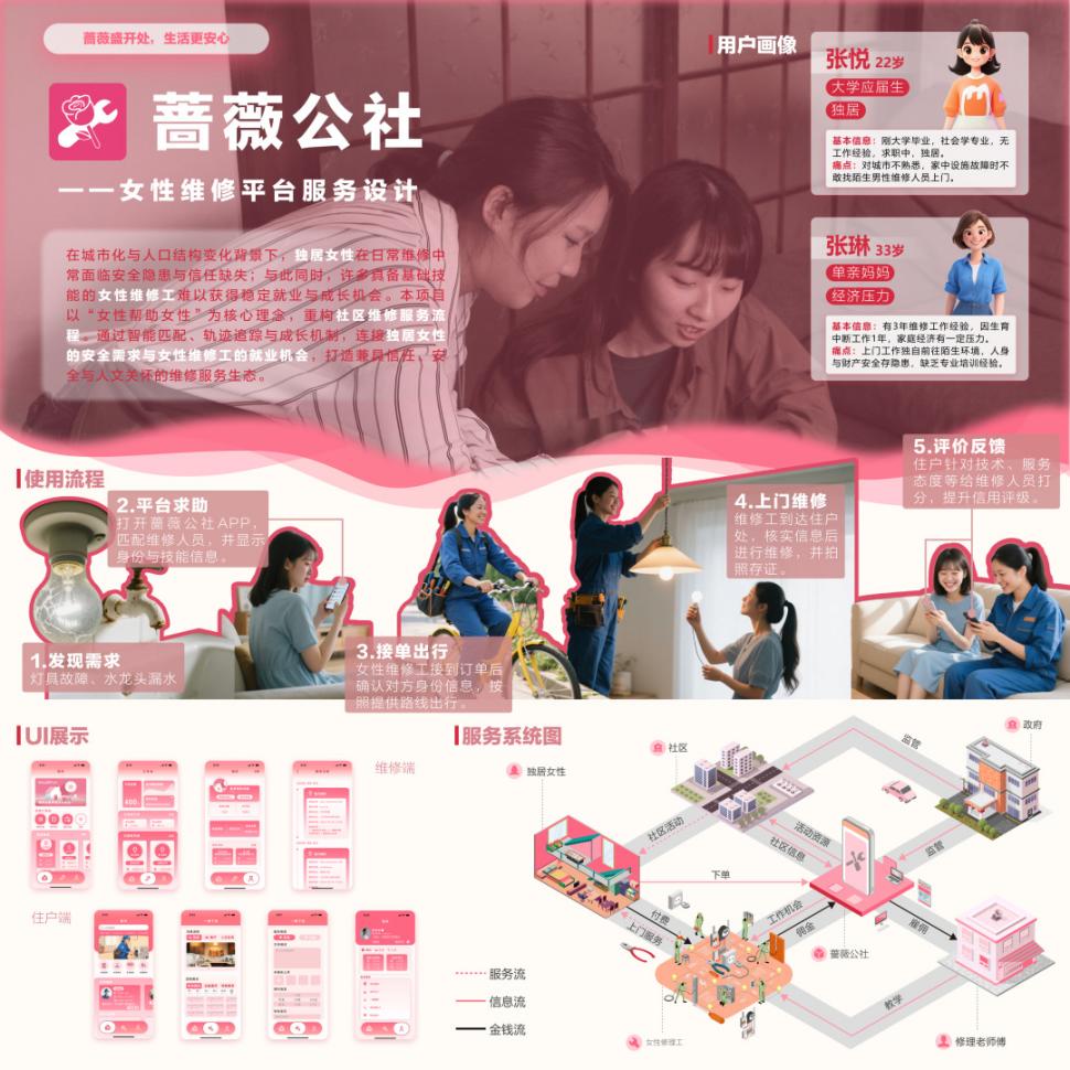 其中,2025级设计专业硕士研究生团队打造的《蔷薇公社——女性维修平台服务设计》项目表现尤为突出,强势晋级大赛六强,获得现场决赛资格。