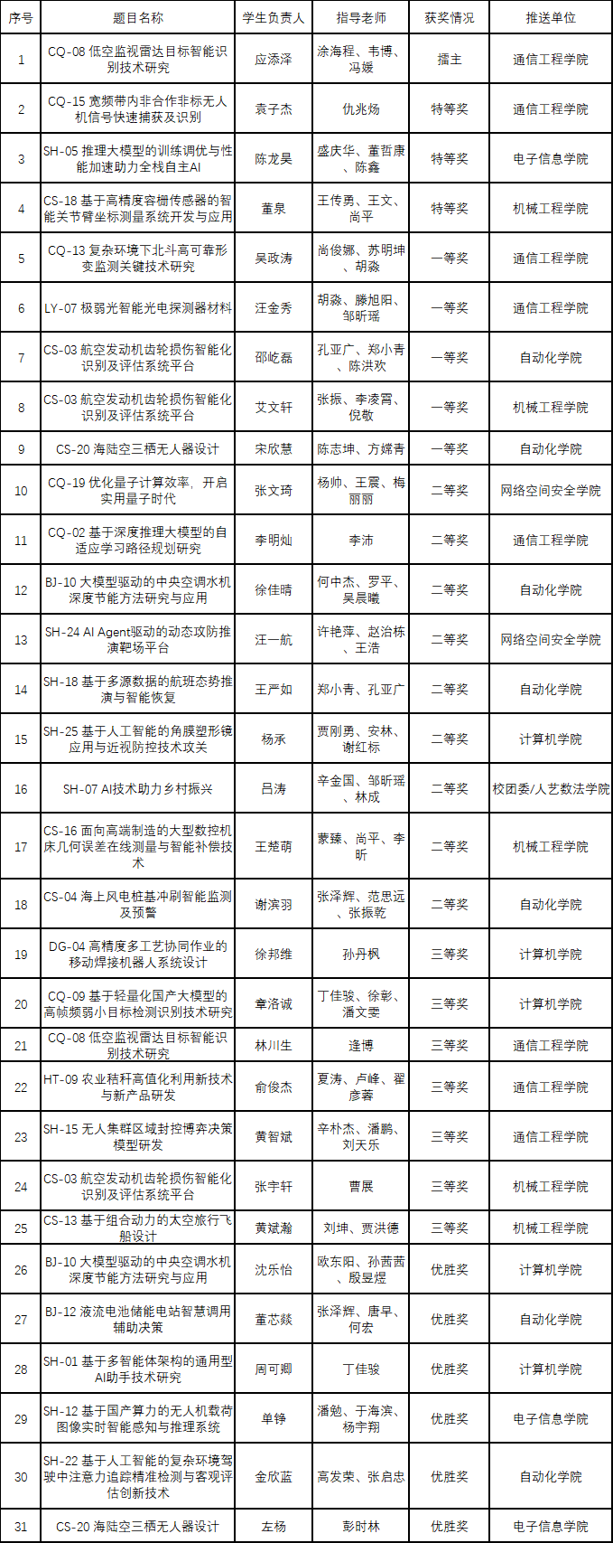 10月28日,由共青团中央、中国科协、教育部、中国社科院、全国学联主办第十九届“挑战杯”竞赛2025年度中国青年科技创新“揭榜挂帅”擂台赛落下帷幕,本届赛事聚焦新一代信息技术、人工智能等8大战略性新兴产业,在全国设立8个主擂台城市。我校共计82支学生团队参加比赛,最终斩获擂主1项、特等奖3项、一等奖5项、二等奖9项、三等奖7项、优胜奖6项,刷新我校在该赛事创办以来的历史最佳纪录,充分展现了我校“以创育人、以赛促学”的显著成效。